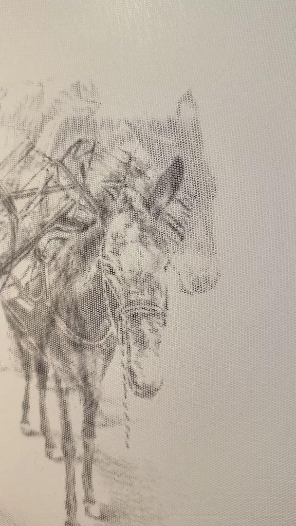 Una recua de mulas avanza lentamente, sus cuerpos repetidos y superpuestos sugieren el ritmo constante del camino y el peso compartido del traslado. El trazo delicado sobre la transparencia del toldillo crea un efecto inefable, como si la imagen emergiera y desapareciera a la vez, evocando la memoria fugaz de escenas rurales que han marcado generaciones. El formato circular opera como un portal íntimo hacia una cotidianidad cargada de esfuerzo, resistencia y vínculo con la tierra. Incluye marco en madera y certificado de autenticidad.